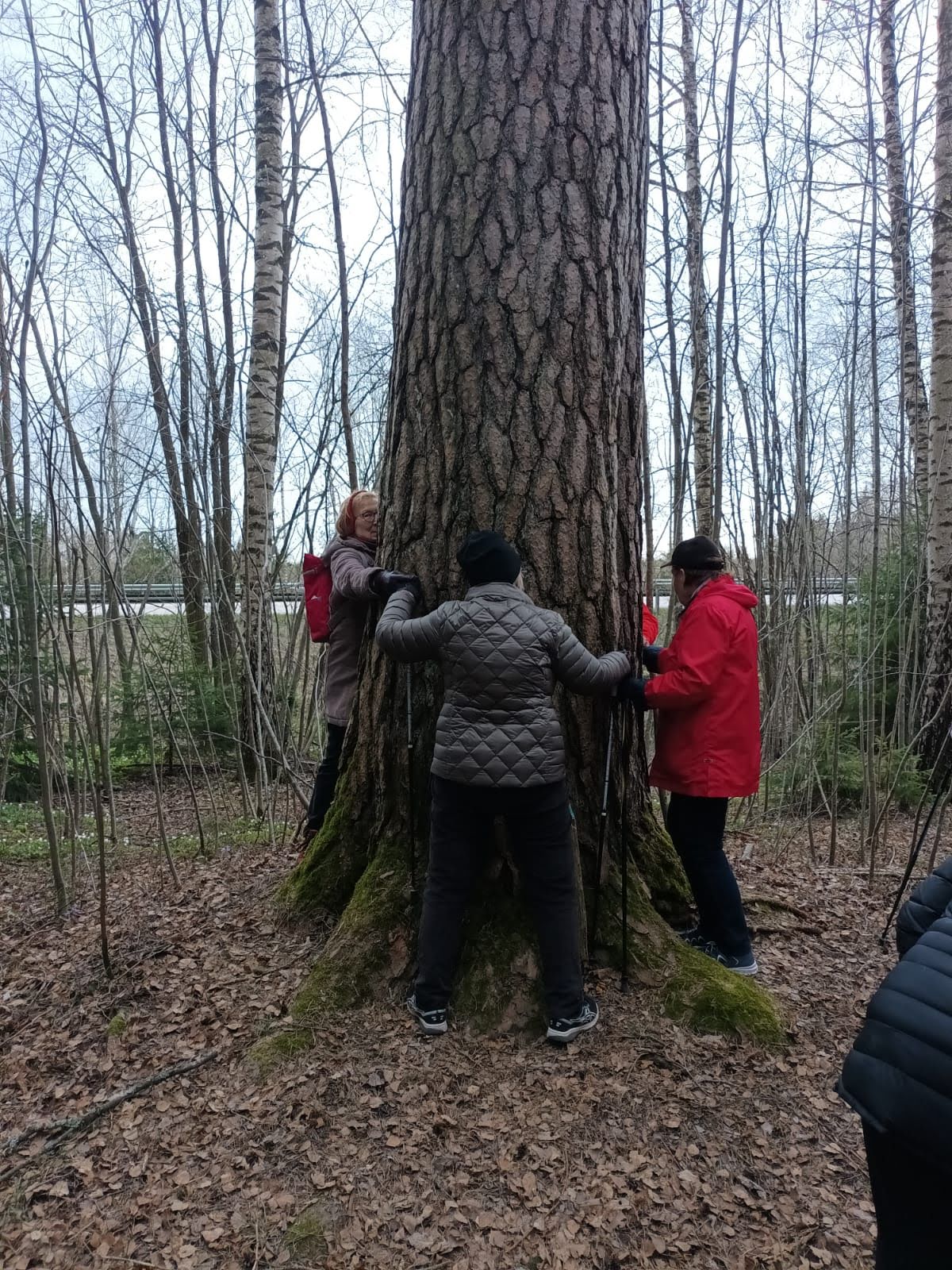 En höstdag hittade vi en stor tall som har varit den största tallen i dåvarande Lojo kommun. Det behövdes flera seniorer för att nå runt stammen.